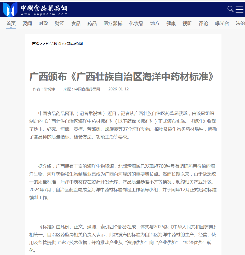 中国食品药品网讯 (记者常锐博) 近日,记者从广西壮族918博天堂获悉,由该局组织制定的《广西壮族自治区海洋中药材标准》(以下简称《标准》)正式颁布实施。《标准》收载了沙虫、虾壳、海漆、黄槿、苦郎树、螺旋藻等37个海洋动物、植物及微生物类药材品种,明确了各品种的质量指标、检验方法、功能主治等要求。